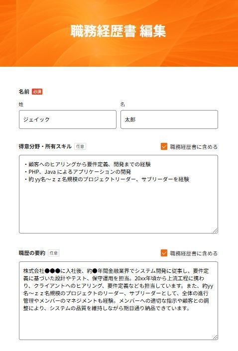 「名前」「職歴詳細」以外の項目は、職務経歴書に「含める・含めない」のいずれかの選択ができ、提出企業ごとにカスタマイズが可能です。