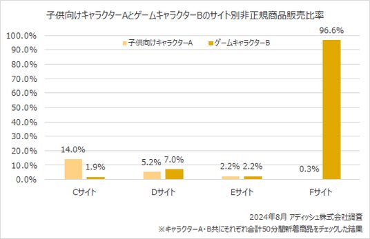 また、特にFサイトにおいて非正規商品販売比率の差が顕著に出ています。ゲームキャラクターBについては、Fサイトではほとんどの商品が非公式のものと見られるという結果になっています。