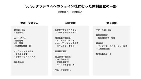 2023年8月にファッションD2Cブランド「foufou(フーフー)」を運営する株式会社foufouは、クラシコムにグループジョインしてから1年をかけて、クラシコムが培ってきた効率的な事業運営に関するノウハウにより、物流・システム・経営管理・働く環境等において経営体制を強化しました。