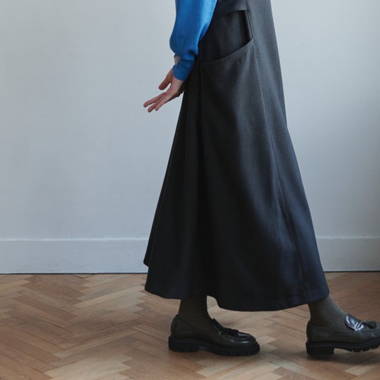 前身頃のボタンを留めるとロング丈のワンピースに。動くたび上品に揺らめくニュアンスグレーの生地。そこに立体的なポケットやウエストベルトがあしらわれ、シンプルなトップスを合わせるだけでおしゃれが決まります。背中にはすらっと見えるタックが入り、360度きれいな自慢のシルエットです。