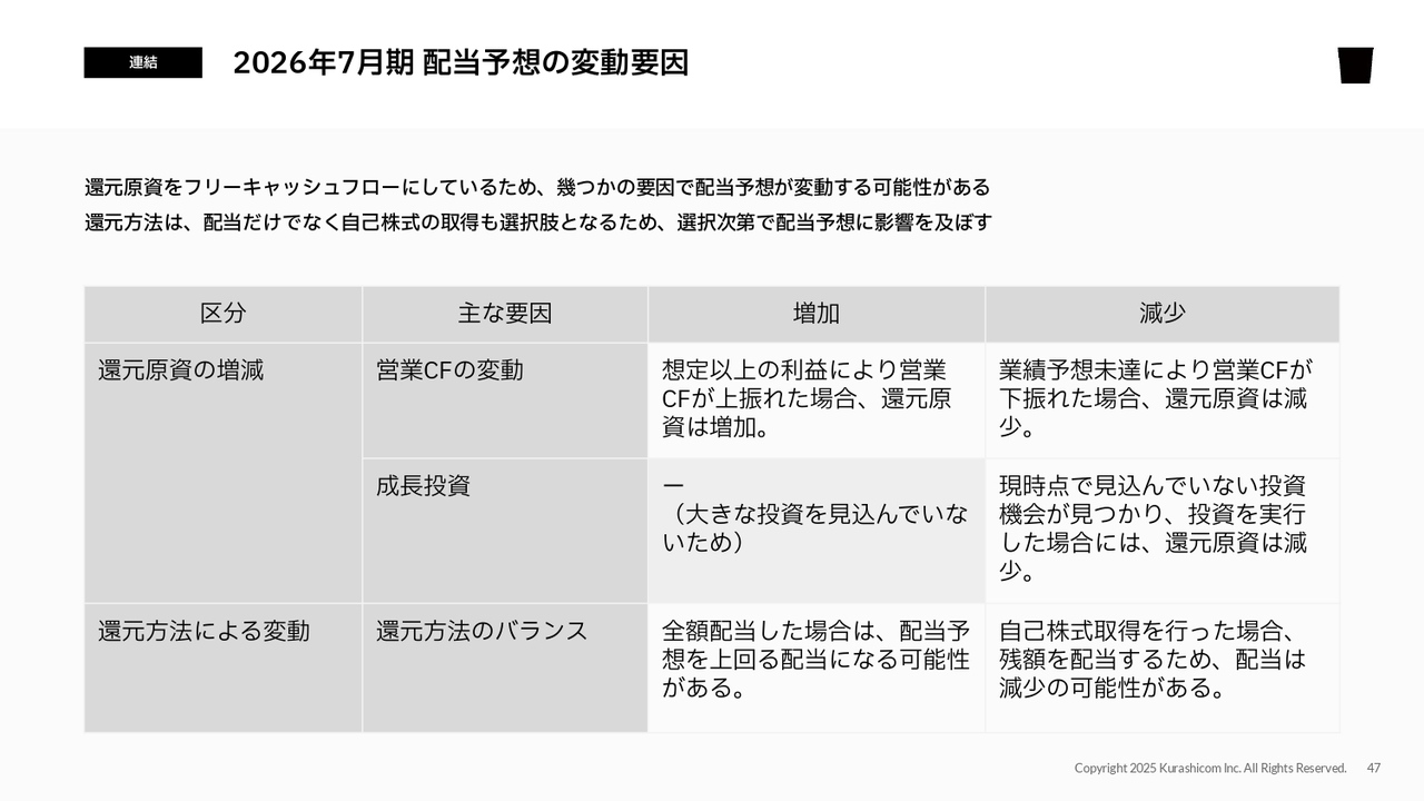 一方で、当社の還元ルールは一定の柔軟性を持った設計となっています。先ほどお伝えしたとおり、配当の原資はフリーキャッシュフローです。そのため、現時点では想定していない新たな成長投資の機会が出現した場合など、フリーキャッシュフローが減少すれば、配当に影響が及ぶ可能性があります。