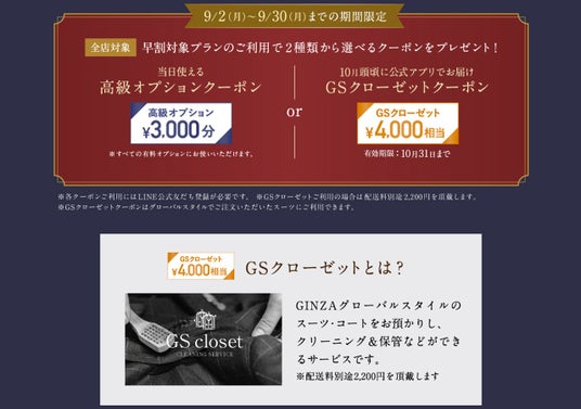 【上場3周年記念】オーダースーツ専門店グローバルスタイルが「早割コンビフェア」を9/2~9/30まで開催。高級オプションまたはGSクローゼットが選べるクーポンをプレゼント!