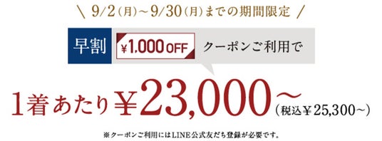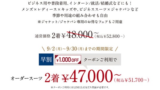 オーダースーツ専門店「グローバルスタイル」を運営するグローバルスタイル株式会社(東京証券取引所 スタンダード市場:7126、本社:大阪市中央区、代表取締役社長 田城弘志)は、9月2日 (月)から9月30日(月)までの期間中、対象プランご利用で、本格オーダースーツ2着:47,000円~(税込51,700円~)+高級オプション3,000円分または、 GSクローゼット4000円相当を選べる【上場3周年記念 早割コンビフェア】を全39店舗で開催いたします。
