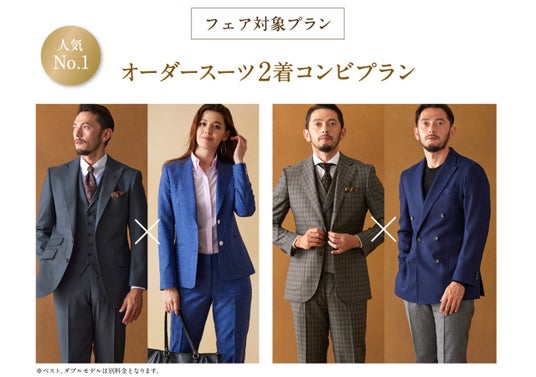 ※コンビプランとは・・・オーダースーツ2着以上ご購入していただいた場合の1着あたりのお値段です。組み合わせは自由ですので、異なる価格帯のオーダースーツと組み合わせていただいても本価格が適用されます。