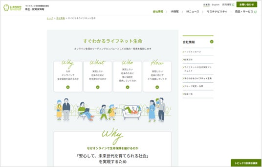 新設コンテンツ「すぐわかるライフネット生命」は、主に個人投資家向けに、当社の事業内容や強みを、Why、What、Who、How で整理し、図やイラストを用いてわかりやすく解説しています。
