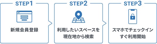 外出中の急なオンライン会議やオンライン商談、テレワーク利用など、好きなときに好きな場所でワークスペースを利用したいというニーズにお応えする「ワークスペース検索サイト」(利用料無料)※です。会員登録していただくことで、異なる運営企業のワークスペースにまたがった横断検索とチェックイン(受付)ができるため、複数のサービスのアプリを起動することなく、タイムリーに好きなスペースを見つけてドロップイン利用が可能です。