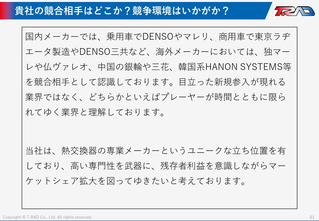 「貴社の競合相手はどこか? 競争環境はどうか?」というご質問です。