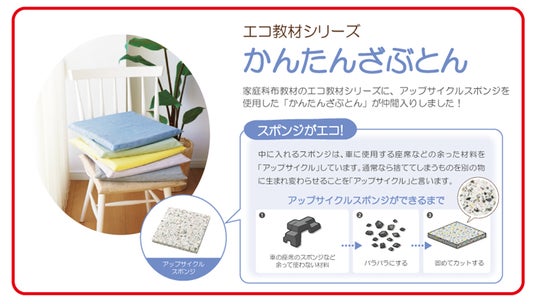 太平洋工業株式会社(本社:岐阜県大垣市、代表取締役社長:小川哲史、以下「太平洋工業」)は、小学校向け図書教材・教具の出版・販売を行う株式会社 文溪堂(本社:岐阜県羽島市、代表取締役社長:水谷泰三、以下「文溪堂」)が開発・販売する小学校向けの家庭科教材「エコ教材シリーズ かんたんざぶとん(以下「かんたんざぶとん」)」に、自社のアップサイクルスポンジ(※1)を供給いたします(2025年4月販売開始)。