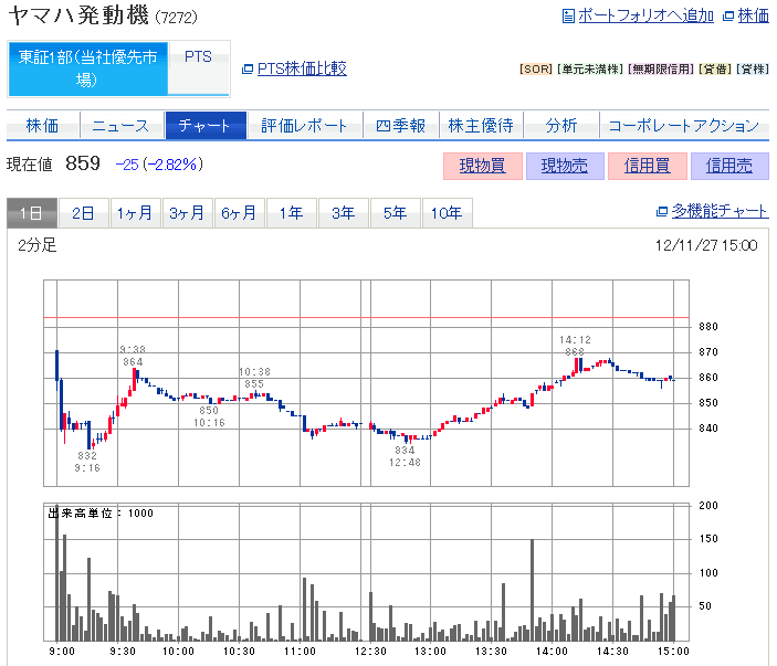 5103 昭和HD 71円 6788 日本トリム 1835円 7272 ヤマハ発動機 1079円 全部持ち越し 仕手株をやめ、スクリーニングで出た新興株にしました。ヤマハは違うツールでよさげな感じだったから買ったけど、雲行き怪しいです。 -