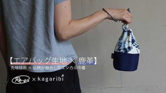 エアバッグを主力とする自動車部品メーカー豊田合成(株)のエシカルブランド【Re-S(リーズ)】と 鹿革の有効活用を手掛けるハンドメイドブランド【kagaribi】のコラボレーション。自動車部品製造過程から出るエアバッグ生地と害獣駆除で発生する鹿革を有効活用し、廃棄物低減/地域課題解決を根差したエシカルな巾着を制作しました。