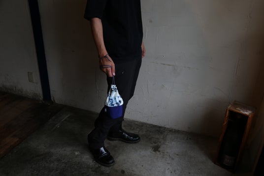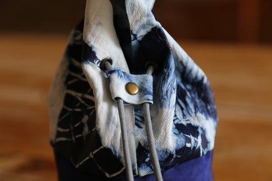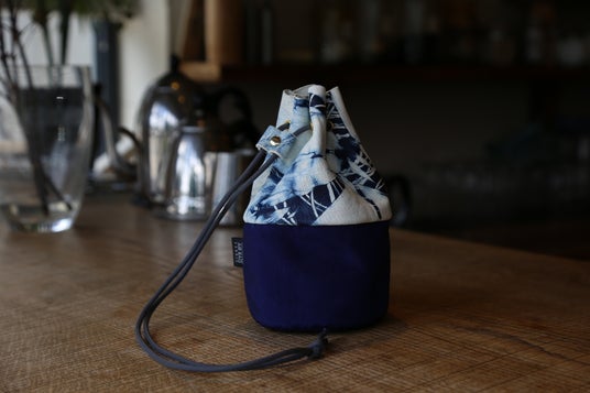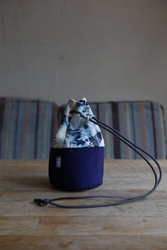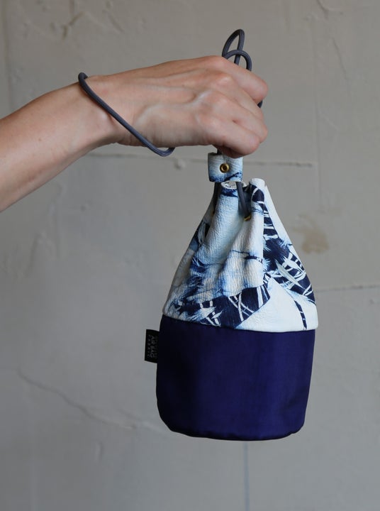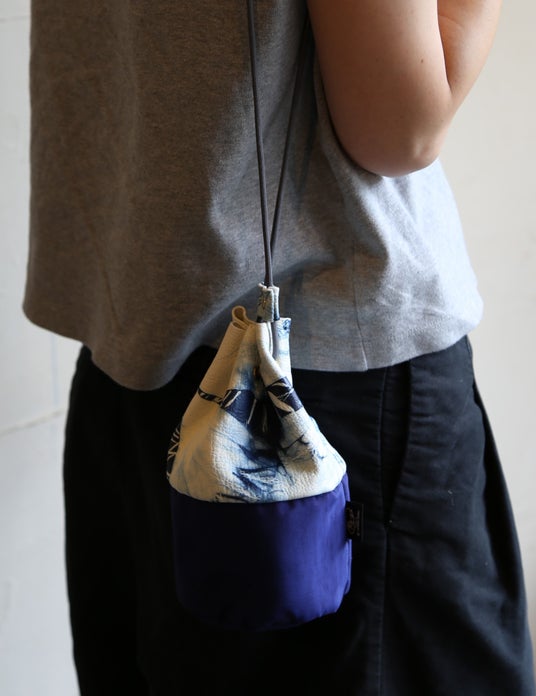 新たなバックスタイルとして見直される巾着。普段使いのちょっとしたおでかけ/夏の浴衣、和装にも。エアバッグ生地+鹿革藍染の類を見ないエシカル素材のコンビアイテム。