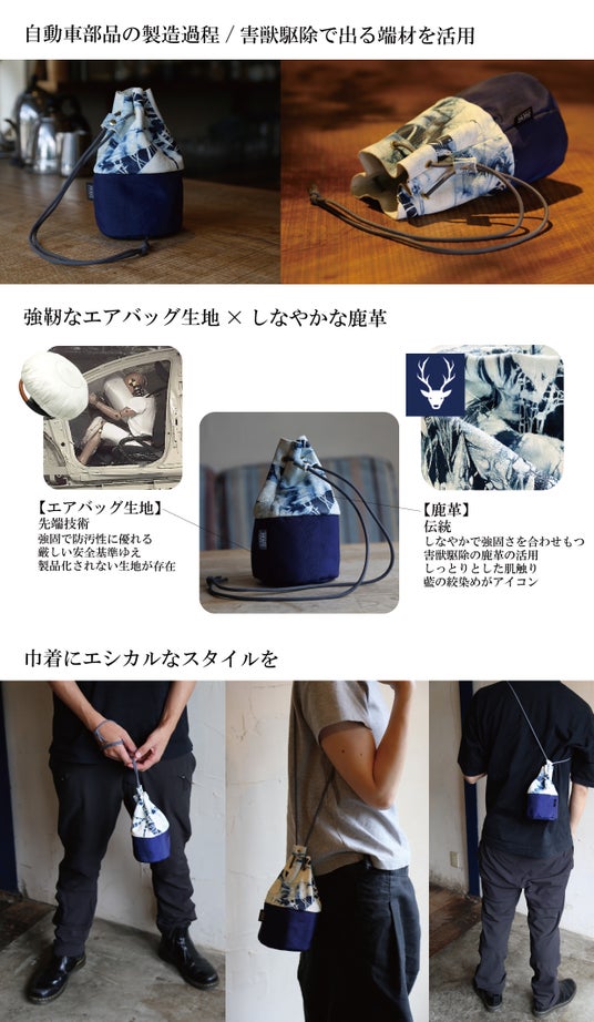 強靭なエアバッグ生地×しなやかな鹿革|先端技術×伝統が融合したエシカル巾着