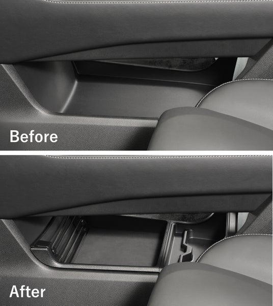 ロアコンソールは一部がシートで塞がれています。そのため、本製品はトレーを2分割することで、設置の際にロアコンソールに入れやすく、シートやコンソールなどを傷づけにくい仕様にしました。車両と接する面には厚めのクッションを装えています。適度なテンションが前後に加わることで、ぴったりフィット。走行中のガタつきを軽減します。