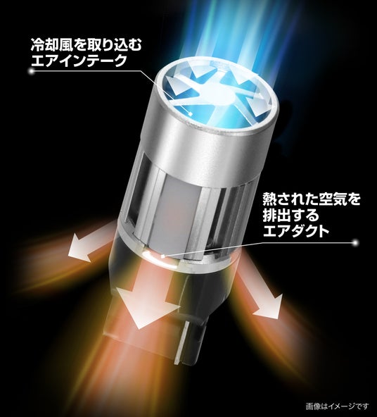 前述の通り、本製品はステルス性を高めるためにLEDチップにカバーをしているため、バルブ本体が高熱になり「ハイフラッシャー現象(以下、ハイフラ)」が発生しやすくなります。そこで、空気が通り抜ける冷却構造により放熱性を高めることでハイフラ対策をしました。バルブ上面の「エアインテーク」から冷却風を取り込み、下部4カ所の「エアダクト」から排熱。LEDチップと電子基板を直接冷却することで電流値の低下を最小限に抑え、明るさを上げたり抵抗ユニットを使わなくても、安定した動作でハイフラの発生を最小限に抑えます。
