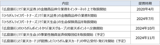 これまでに証券・保険など資産運用の分野で連携を拡大し、楽天グループの豊富な金融商品を活用してお客さまの資産運用ニーズへお応えしてまいりましたが、10月からはひろぎんポイントの「楽天ポイント」への交換開始、11月には「楽天カード」との提携カード取扱など決済分野にも連携を拡大し、お客さまの生活の利便性向上に繋げてまいります。