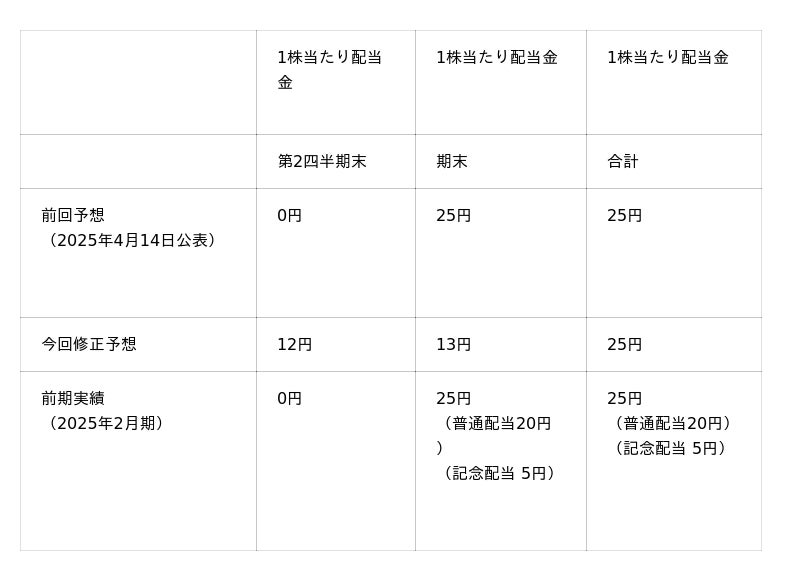 2026年2月期の配当予想について、当初1株当たり25円の期末配当を予定しておりましたが、中間配当を実施することに伴い、下記のとおり修正することといたしました。