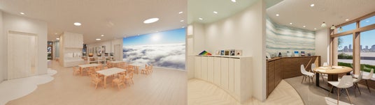 羽田空港からアクセスがよく、日本各地や世界とつながり、また、未来に向けて進化を続ける高輪。そんな街を象徴する保育園として、内装デザインは「空」をコンセプトにしています。室内全体の壁や天井にはどこまでも広がる空が描かれ、保育室に加えてお子様がのびのびと過ごせるピアッツァ(広場)や、キッチン前には食育にも使える広々としたランチホール(ダイニング)も備えています。また、保護者様が活用できるコワーキングスペースも設置予定。お迎え前に仕事をするなど、保護者様が自由に使える空間です。