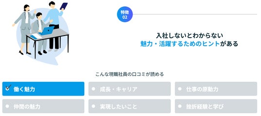 リリースから約2年の間、3万件の口コミを収集分析する中で、活躍社員の口コミには仕事のやりがいや会社の魅力、ビジョン共感など、求職者の動機形成につながる社員の「今ここにいる理由」がより色濃く表れていることがわかりました。