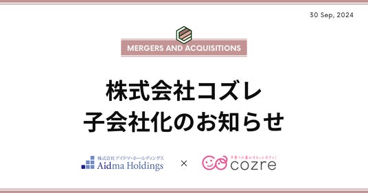 人の力とテクノロジーで再現性のある経営ソリューションを提供する株式会社アイドマ・ホールディングス(本社:東京都品川区、代表取締役:三浦 陽平、以下:当社)は、子育ての悩みを解決する国内最大級のメディアを運営する株式会社コズレ(本社:東京都千代田区、代表取締役:松本 大希 、以下:コズレ)の株式を取得し、2024年9月30日(月)に子会社化したことをお知らせします。
