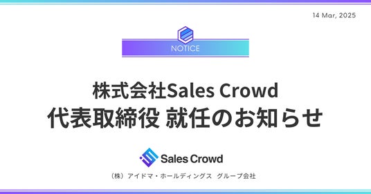 株式会社アイドマ・ホールディングス(本社:東京都品川区、代表取締役:三浦 陽平)の100%子会社の株式会社Sales Crowd(本社:東京都品川区、代表取締役:渡邊 芙美、以下:Sales Crowd)は、2025年2月20日付けで、代表取締役に渡邊 芙美(わたなべ ふみ)が就任したことをお知らせします。