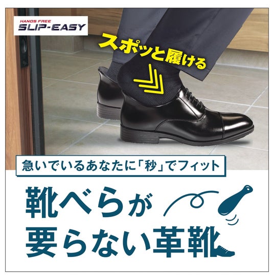 一般的に着脱の際に靴ベラを使用し、椅子や玄関先で腰掛けながらや、しゃがみながら履くことが多いビジネスシューズの“履き方”に着目し、スポッと素早くラクに履くことができる新感覚ビジネスシューズ“SLIP-EASY(スリップイージー)を発売いたします。