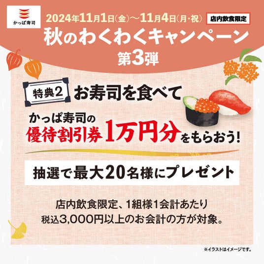 山角豪)は、2024年11月1日(金)~11月4日(月・祝)の期間、『秋のわくわくキャンペーン第3弾』を、かっぱ寿司全店で開催いたします。