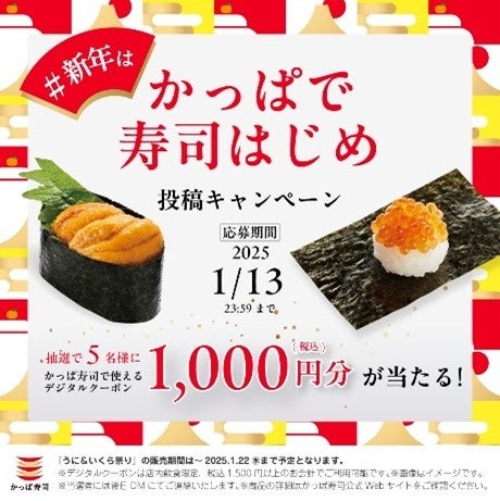 2025年1月9日(木)~1月13日(月・祝)に、かっぱ寿司公式アカウントのフォロー&該当投稿への返信ポストをすると、抽選で5名様にかっぱ寿司で使えるデジタルクーポン1,000円分(税込)が当たるキャンペーンを開催いたします。