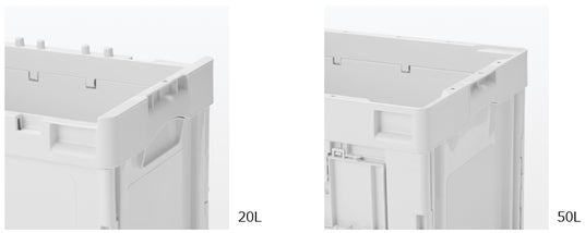 *20Lは積み重ねた時に突起が底板のリブにはまってずれにくくなる構造、50Lは積み重ねた時に底板が口枠にはまってずれにくくなる構造です。