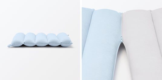 春夏限定のひんやりタイプのクッションシリーズに、つながるマルチクッションが登場します。触れたときにひんやりする接触冷感性 のある生地を使用しています。背当てだけではなく、シートクッションや丸めてつなげて机の上で使うお昼寝クッション、複数個をつ なげることで長いクッションにもなり、ごろ寝にも使えるマルチクッションです。詰め物は繊維の太さが異なる 2 種類の綿をブレンド し、やわらかくもちもちとした弾力があります。詰め物を包む側生地はポリエステルに弾力のあるポリウレタンを混ぜることで、中のも ちもち感を損なわず体に沿うことができる伸縮性があり、さらにナイロンを入れることで熱伝導率を上げ、ひんやり感を確保しまし た。見た目にも涼しいライトブルー、ライトグリーン、グレーの 3 色展開です。同色で「マルチクッション」「マルチミニクッション」「背当 てにもなる抱きまくら」「低反発シートクッション」のひんやりタイプも発売します。