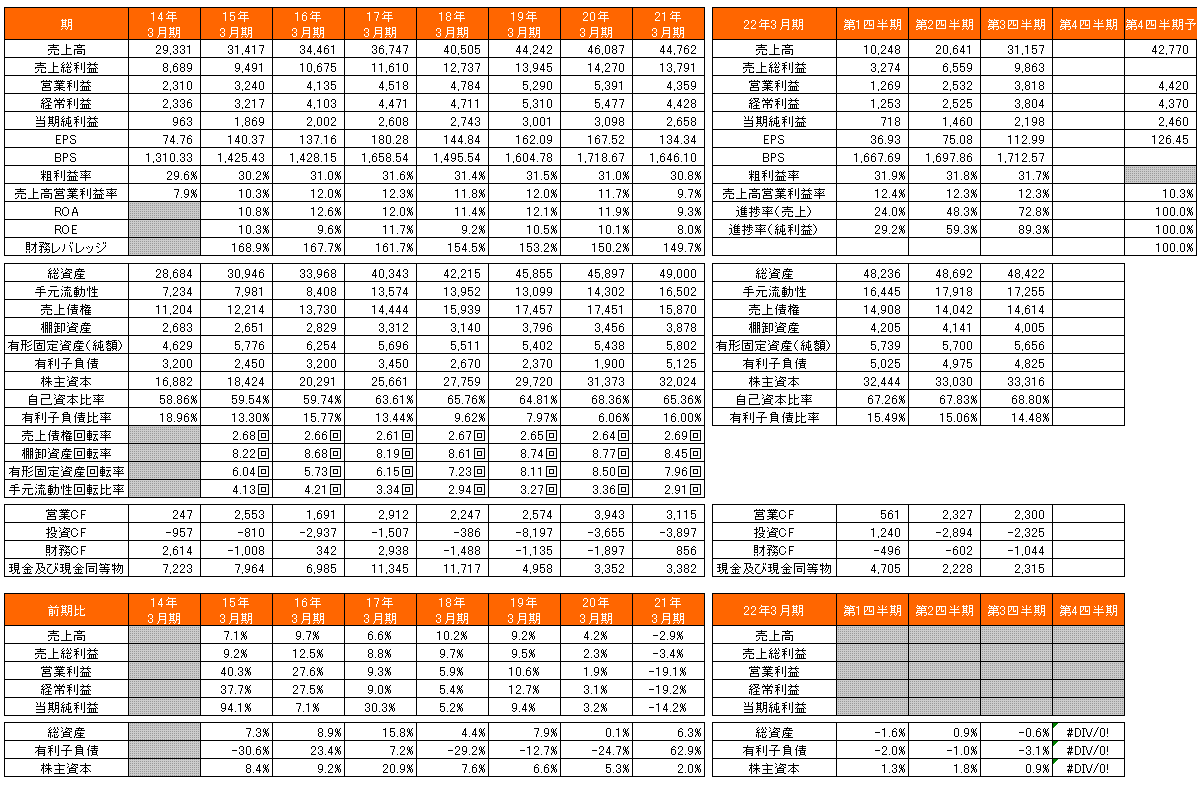 過去の経営成績を見ると、粗利益率は約29~31%を維持している。売上高営業利益率は粗利率に左右され、7~12%で推移していた。今期は、販管費を抑えた効果があり12%まで上昇している。ROAはほぼ10%超で安定している。また、過去数年間を見て有利子負債比率が20%以下なので、健全経営を続けていると思われる。