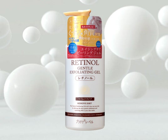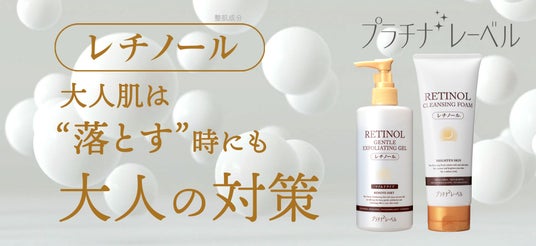 今話題の成分『レチノール(*2)』は、ビタミンAの1種です。その作用から、加齢による肌のごわつきを改善し、キメを整え、なめらかな肌を目指すことができます。本製品はその他にもエイジングケア(*1)に必要な多種の『美肌へ整える成分』を贅沢に配合。プラチナレーベルのコンセプトである「惜しまず使えるスキンケア」の満足サイズで、スキンケアの最初に使う洗顔料と、気になる角質によるくすみを解消し、つるつるのたまご肌を目指すピーリングジェルを開発しました。