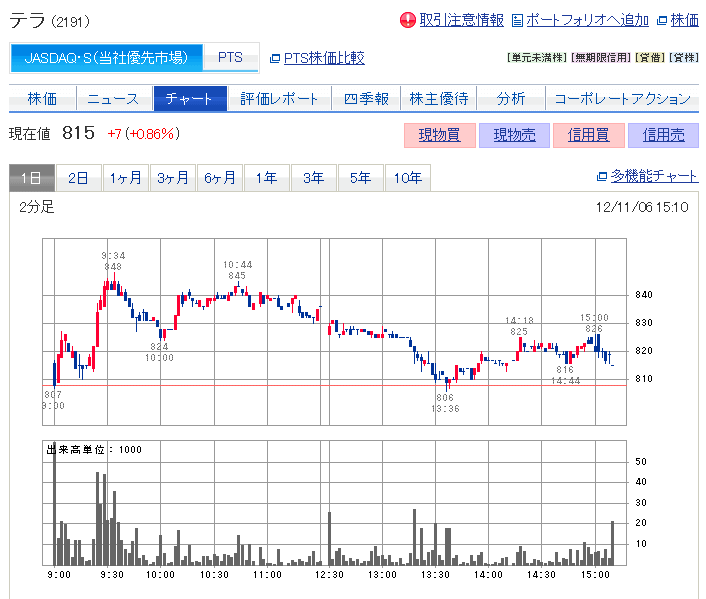 システムソフト(7527)、先日トレードしましたが、ここ2日間の日中足および日足から考えて、まだ上値があると考えています。ということで、本日123円で12,000株買いました。   アイフラッグ(2759)、150円台でもみ合い中。156円で5,000株買いました。