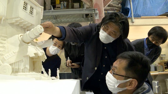2024年3月、ジブリパークの5つのエリア全てがオープンしました。最後に開園した「魔女の谷」でひときわ目立つのは、映画『ハウルの動く城』に登場する城です。想像上のものをどのように現実世界で表現するのか。宮崎吾朗監督は、川原正毅さんをはじめとする多くの専門家たちと共に作りあげました。まずスケッチを描き、それをもとに図面が作られ、模型を制作。実際に立体で表現されたものを見ながら修正を加えます。城全体の造形が決まり設計が終わると、次はいよいよ建設です。城の建設に携わるスタッフが模型の展示会場に集められ、説明会が開かれました。