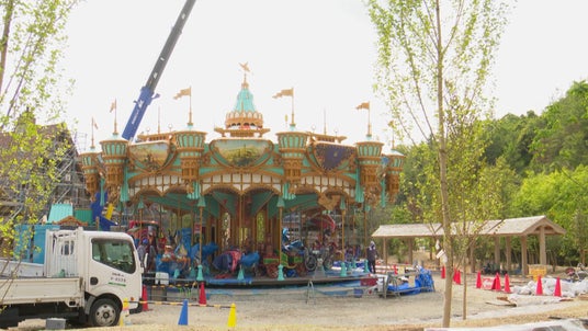 もう一つの新しいエリア「もののけの里」は、里山づくりの体験型プログラムを実施している「あいちサトラボ」と隣接しています。吾朗監督は、ここに『もののけ姫』の世界を表現する場所を作ろうと考えました。タタラ場をモチーフとした建物を建設し、タタリ神のオブジェや乙事主の滑り台も計画します。職人さんたちによって鉄筋で骨組みが作られると、予定地に運ばれ、コンクリートで肉付けされ、表面の仕上げ作業に入ります。一方「魔女の谷」でも「メリーゴーランド」などの遊具が作られる計画です。吾朗監督は、ジブリらしい遊び心ある乗り物にしたいと考えました。作曲家の久石譲さんは、メリーゴーランドの動く時間に合わせて、新たに「人生のメリーゴーランド」を演奏・収録しました。
