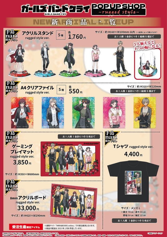 玩具や映像・音楽ソフト、ビデオゲーム、アミューズメント関連商品などエンタテインメント商材の流通及び企画販売事業を展開する株式会社ハピネット(本社:東京都台東区、代表取締役社長:榎本 誠一、証券コード:7552)の子会社である株式会社ハピネット・メディアマーケティング(本社:東京都台東区、代表取締役社長:鶴丸 智康)は、2024年12月3日(火)より『ガールズバンドクライPOP UP SHOP~rugged style~』を全国のHMV,HMV&BOOKS4店舗にて開催し、キャラクターデザイン手島nari描き下ろしイラストを使用した新グッズを販売します