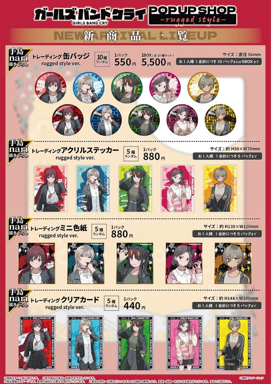 『ガールズバンドクライ POP UP SHOP~rugged style~』では手島nari描き下ろしイラストを使ったグッズ販売のほか、等身大スタンディの展示もお楽しみいただけます。