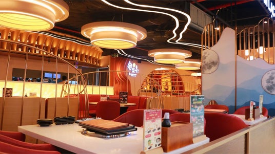 外観では「ANRAKUTEI」看板がひときわ目をひくなか、店内には、奥に広がる「月」をモチーフにした幻想的な空間に、6カ国語対応のタブレットオーダーを準備してお客様をお迎えいたします。