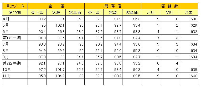 店舗展開では、南関東・近畿以西を中心に人口の多い地域でのドミナント化を進めるとともに、既存店のスクラップ&ビルドと低収益店舗のクローズを実施いたしました。当第2四半期累計期間は、開店13 店舗、スクラップ&ビルド5店舗、閉店7店舗を実施、平成21 年9月30 日現在の営業店舗数は、フランチャイズ・ストア(加盟店A契約店舗)が前事業年度末より6店舗増の507 店舗、直営店(加盟店B契約店舗及びトレーニング・ストア)は前事業年度末と同数の127 店舗で、1都2府32 県下に合計634 店舗となった。