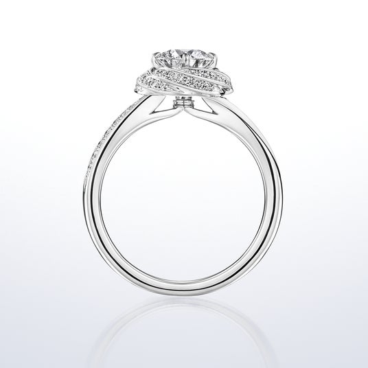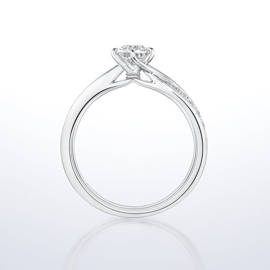 進み続ける時を表現するメレダイヤモンドをサイドからも見えるよう、巻き付くように繊細にセッティングしています。細く絞られた石座はふたりが結ばれる姿をイメージしています。