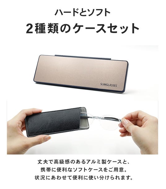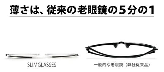大好評!スマホよりうすくて軽いモバイル老眼鏡「スリムグラス」の女性用がご要望にお応えして新登場!1800名を超える女性の頭部データに基づき、約13gと軽くてかけやすさを徹底追及した老眼鏡。視界を明るく保ちながらもブルーライトを30%(JIS規格)カットするレンズを採用。