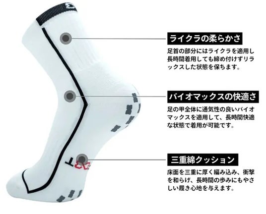 ソールは綿三重クッションで心地良く、足の甲はバイオマックスで快適さを与え、足首はライクラで優しく抑えてくれる3つの効果を一度に感じることができます。