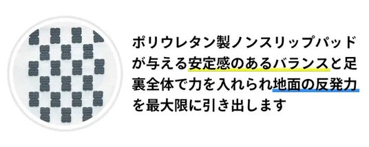 ノンスリップパッドによる滑り止め効果がどのようにすれば最も大きく現れるのか、数多くの科学的研究を経てきました。地面を蹴って前に進む時、一番大きな力を受ける部位、急激な方向転換をする時はどの部位に負荷がかかるかなど…その結果、足の前頬70%、かかと20%、親指10%という理想的な配分がわかりました。激しい活動の中で最高のパフォーマンスを出すために、最適な位置、そして最適な個数を選定してパットを設置しました。靴を着脱しやすいのに滑らないポリウレタンパッドをお試しください!