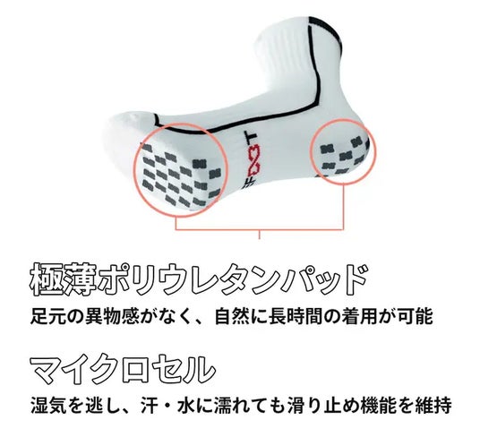 ソックスの内外両面にノンスリップパッドが付いているので、足裏/ソックス裏を2重にサポートします。また、ノンスリップパッドが内側と外側に非対称に取り付けられ、隙間のないグリップ力を最大限に発揮します。