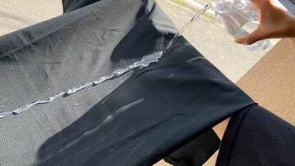 細かい通気孔がある素材ため、通気性が保たれているのも大きな特徴であり、これは「撥水」と「防水」との違いです。(多くの水などを汲むと生地に圧がかかってシャワー状に水が出てきます)水を汲んで写真のようにシャワーとしても使うことができ、防災時に役立ちます。