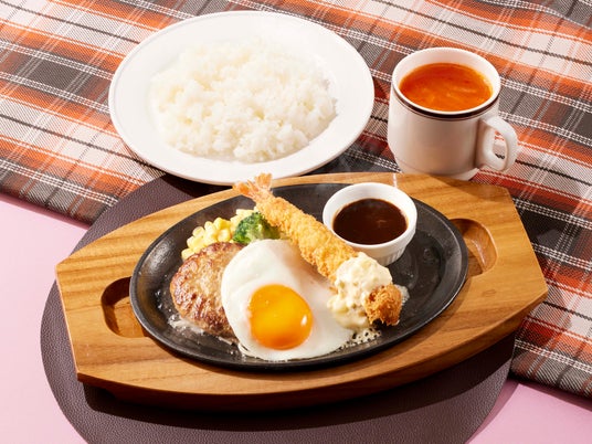 ココス自慢のジューシーな合い挽きハンバーグに、目玉焼きと海老フライを豪快にのせた“大人のおこさまランチ”が登場です!
