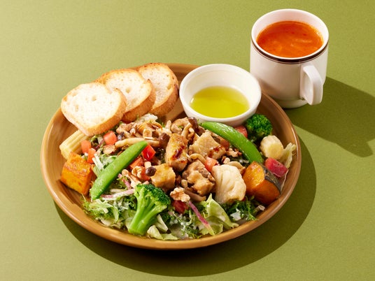 夏のランチメニューに続いて登場する「チキンとナッツの11種野菜サラダランチ」は、具材たっぷりで食欲の秋にもぴったりです。