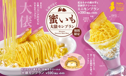 株式会社ビッグボーイジャパン(代表取締役社長:平山 賢太郎 本社:東京都港区)が展開するハンバーグ&ステーキレストラン「ビッグボーイ」「ヴィクトリアステーション」では、9月12日(木)より、“紅はるか”の焼き芋と“安納芋”のモンブランクリームを使用したデザート「しぼりたて 蜜いも大俵モンブラン」2種を販売します。