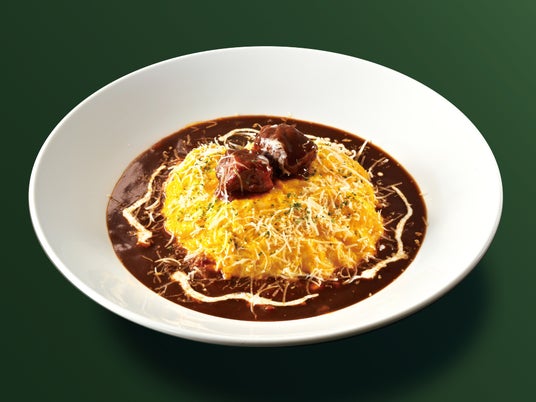 ココス自慢のじっくり煮込んだビーフシチューを回しかけ、とろっとろのビーフとグラナパダーノチーズをトッピングしました。ひとくち食べれば、バターで焼いた玉子の香りと旨みが食欲をかき立てます。