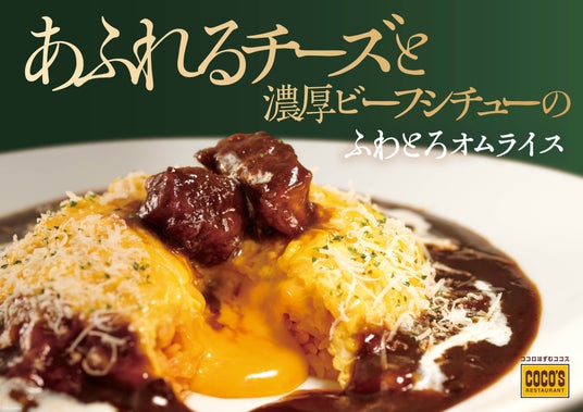 【ココス】5種のチーズと卵3個を使用した半熟ふわとろオムライス!「あふれるチーズと濃厚ビーフシチューのふわとろオムライス」が新登場!