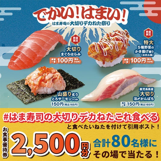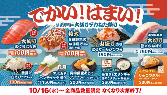 株式会社はま寿司(代表取締役社長:町野 岳 本社:東京都港区)が展開する100円寿司チェーン「はま寿司」は、10月16日(水)より、「はま寿司の大切りデカねた祭り」を全国の店舗で開催します。